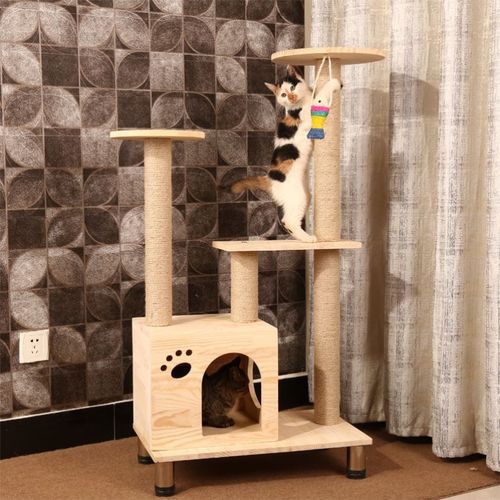 猫架:将绳子绕在纸管上,将地毯包在经高温处理压制的刨花板上,然后用金属件连接,高约40~50厘米的架子,用作宠物玩具。