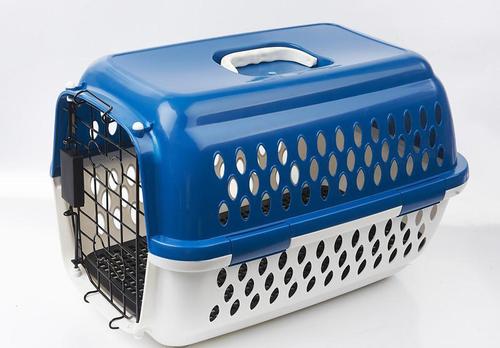 宠物用航空箱:由拎手、搭扣、上盖、底盆和铁门组成。拎手、搭扣、上盖、底盆材料为聚丙烯。铁门为铁丝。用于放置宠物的可透气的箱体,箱体的侧部至少开设一个用于允许宠物进出箱体内的开口部。用于搬运宠物或限制宠物的活动范围。